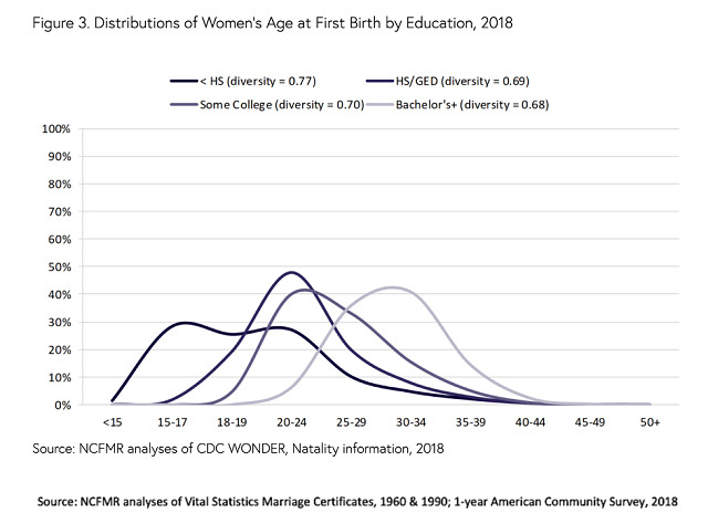 Among those who have not completed high school, the most common age range for first births is 15-17. This not surprising because early first birth can interfere with continuing education. It is also a very small part of the overall story as most women in the United States do complete high school (those who do not are a small share of the population). What drives the class inequality story is that the modal age at first birth for those who have completed high school but do not have a four-year college degree is in the 20-24 range, whereas it is a full decade later for college graduates.